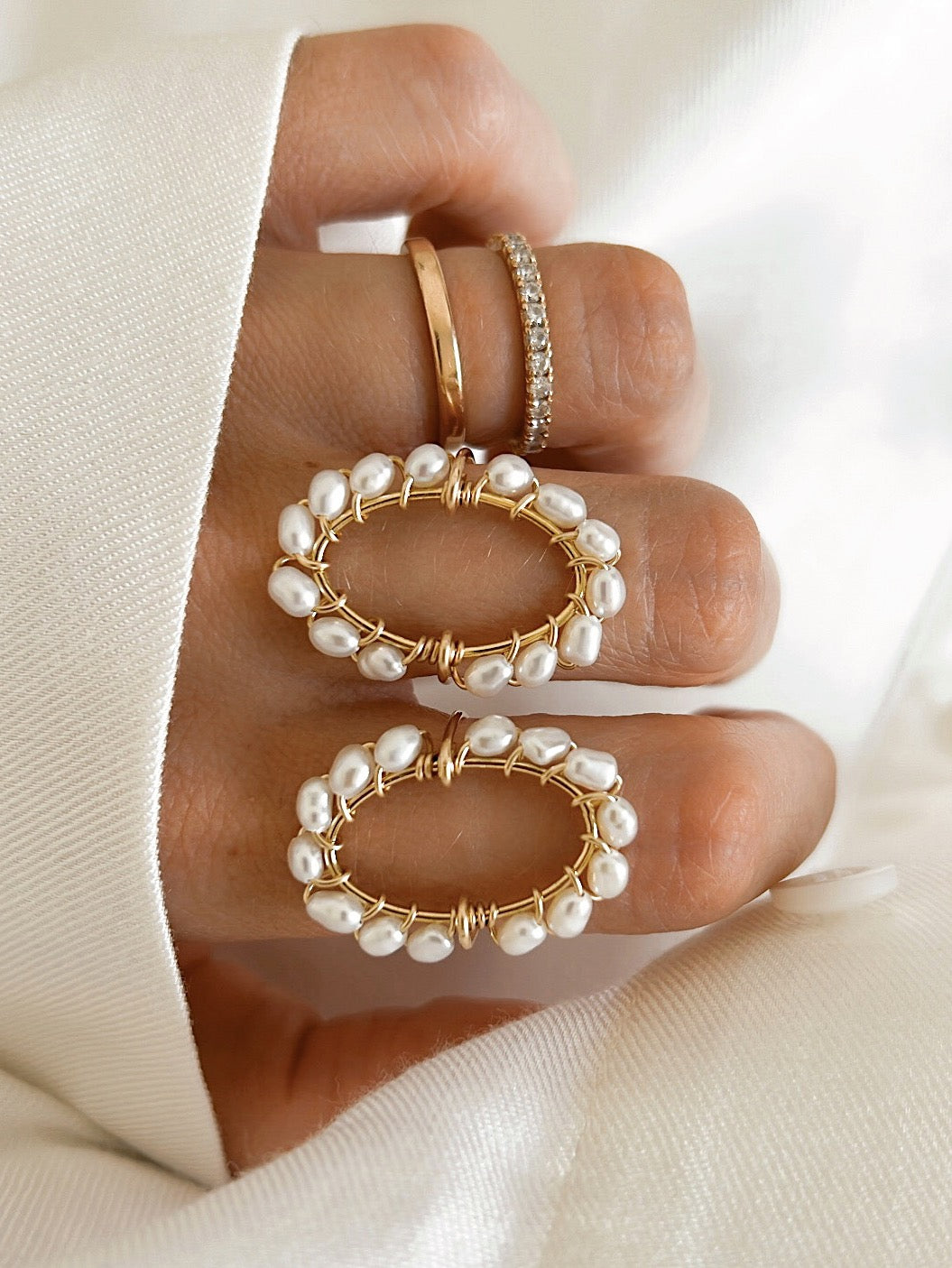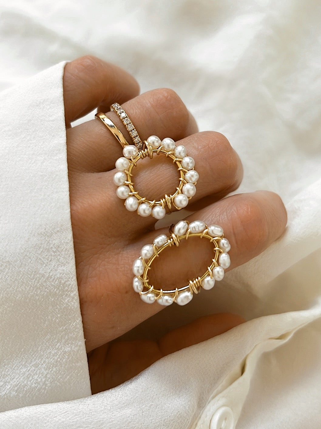 La bague Laia est composée de perles d’eau douce, telles des pétales de fleurs tissées les unes aux autres autour d'un anneau. Le diamètre central est de 1,5 cm x 2,5cm environ.