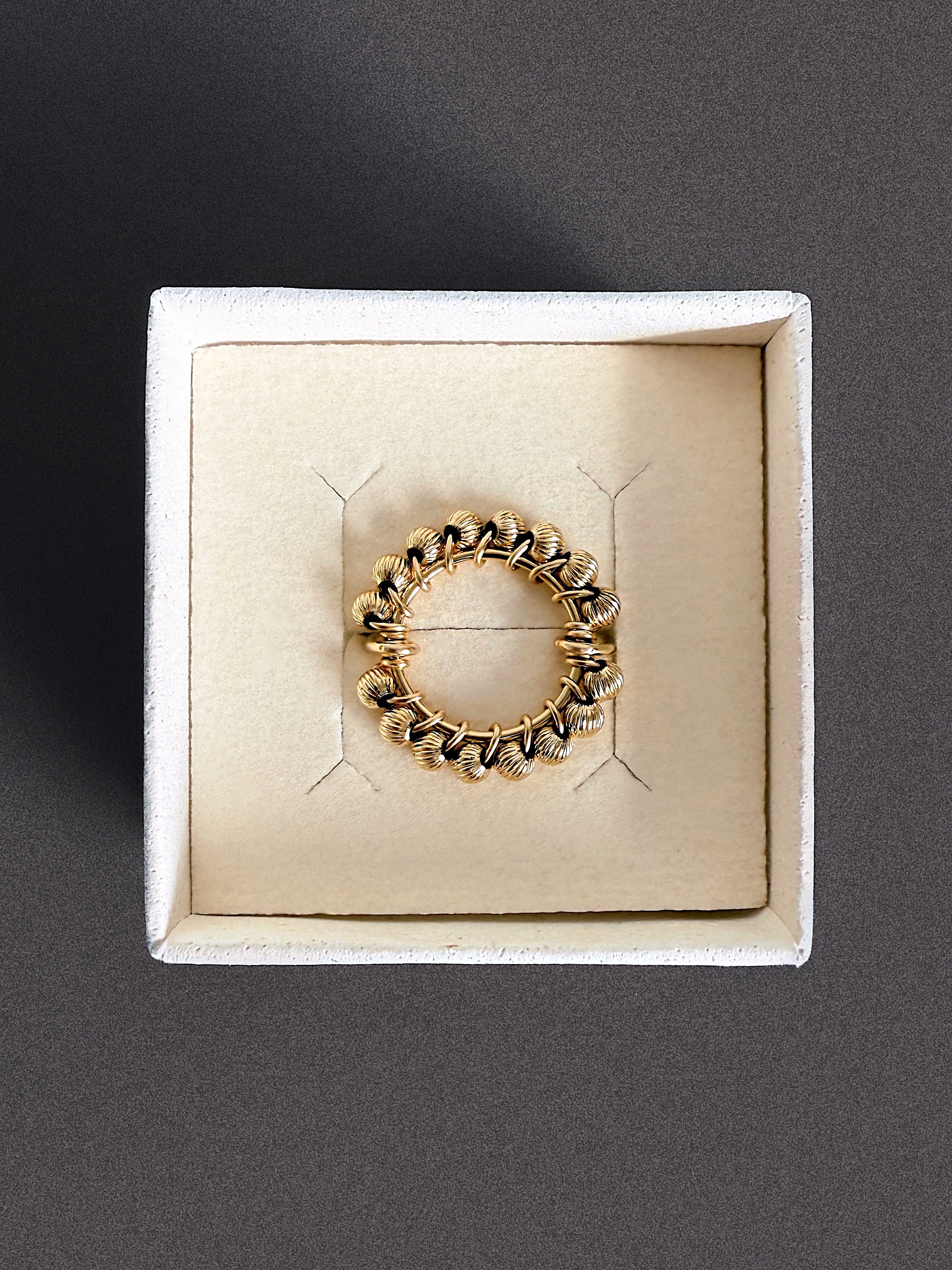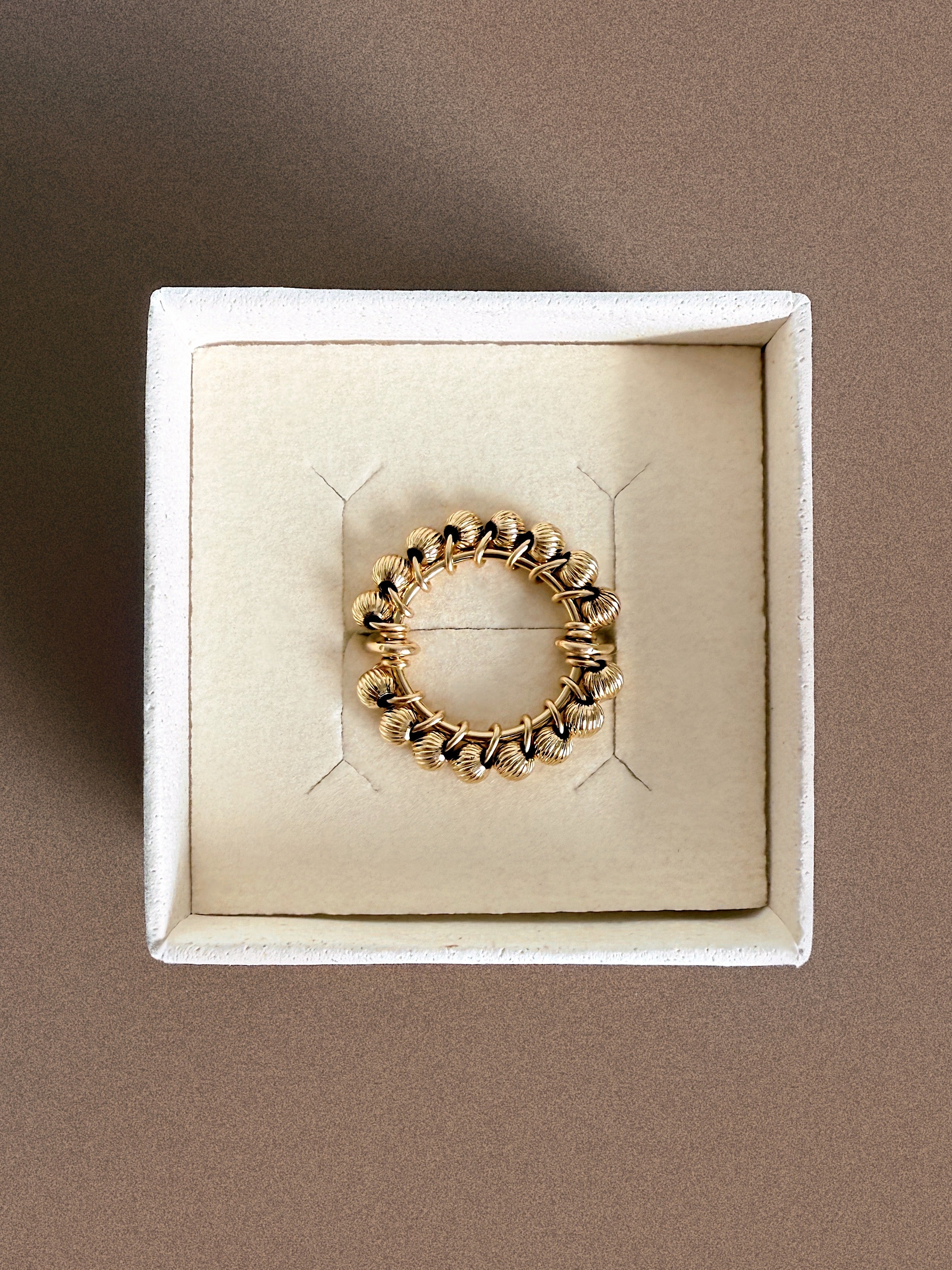 Elle est composée d’un anneau de 15,5mm et de perles ciselées de 3mm. Un bijou unique, précieux et ensoleillé, en or laminé 14 carats.