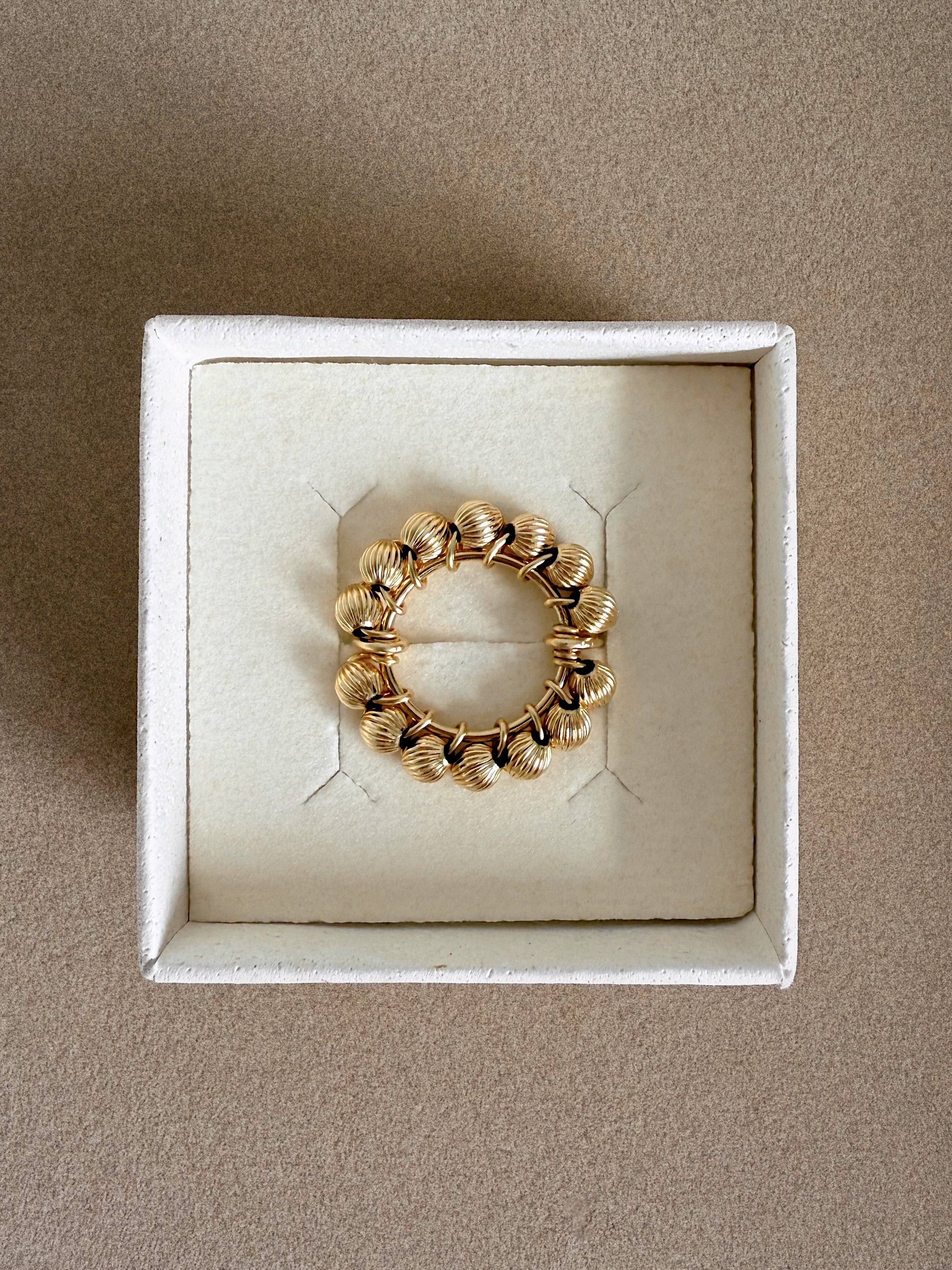 La bague Solaire Alba, modèle signature de la marque, est entièrement façonnée et tissée à la main dans notre atelier.
