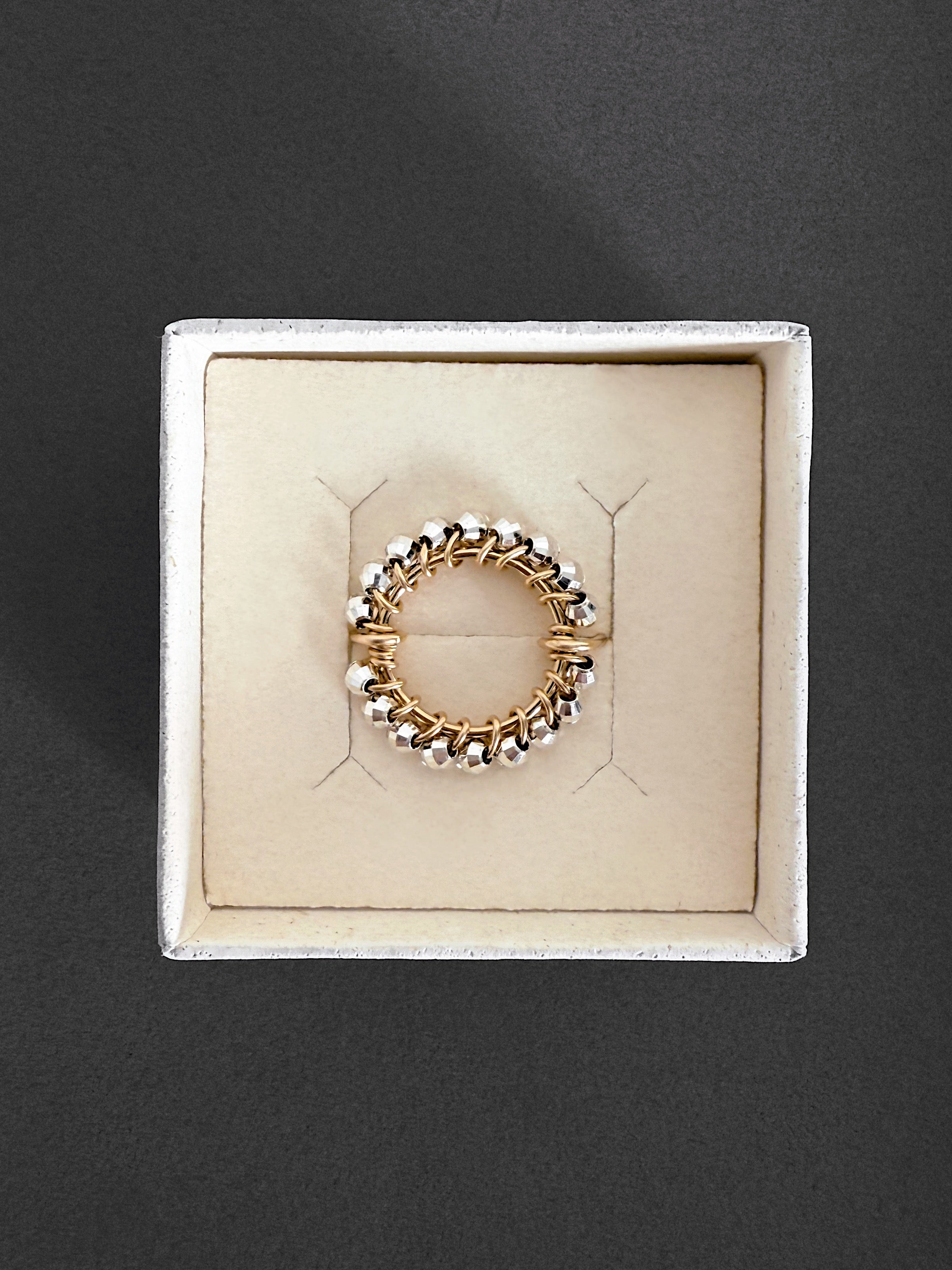 Pour cette collection, la bague s’orne de lumineuses perles d’argent massif facettées, délicatement tissées.
