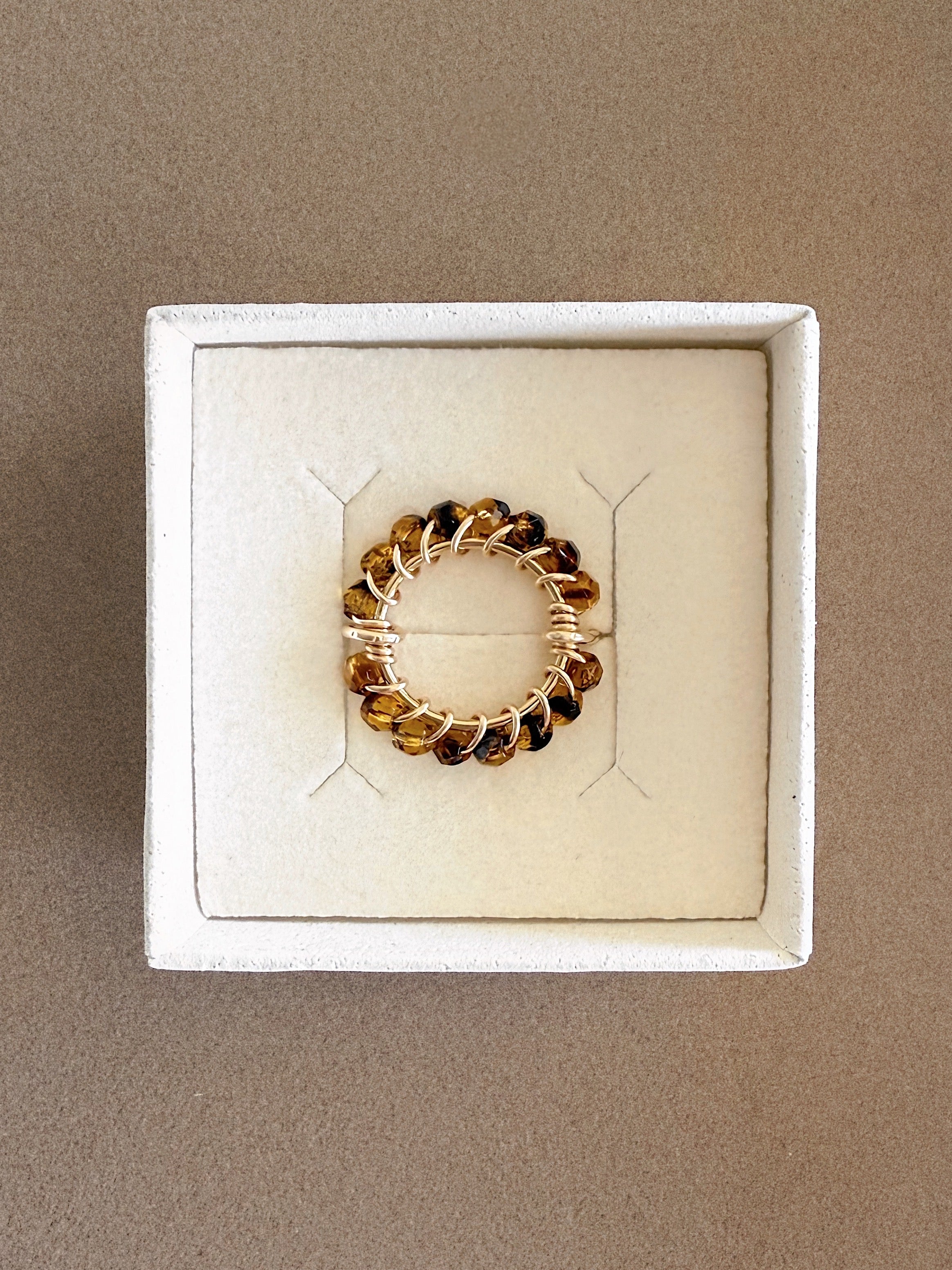 Une collection exclusive en perles de cristal de bohème et or laminé 14 carats, lumineuses et précieuses, aux douces nuances de jaune et marron pour un effet léopard.