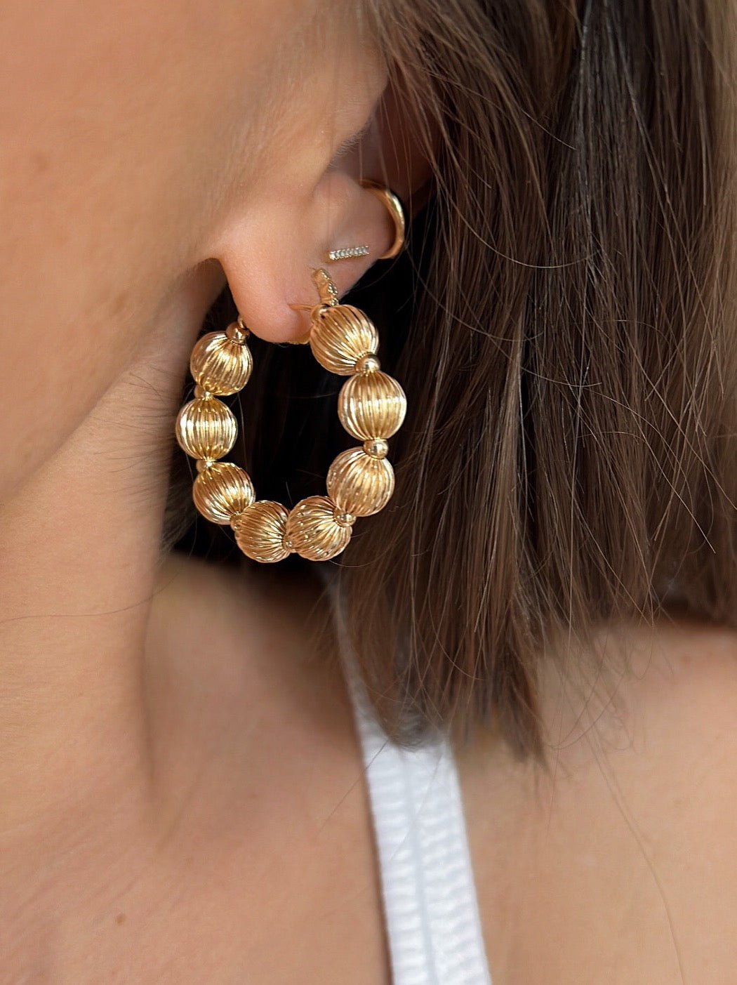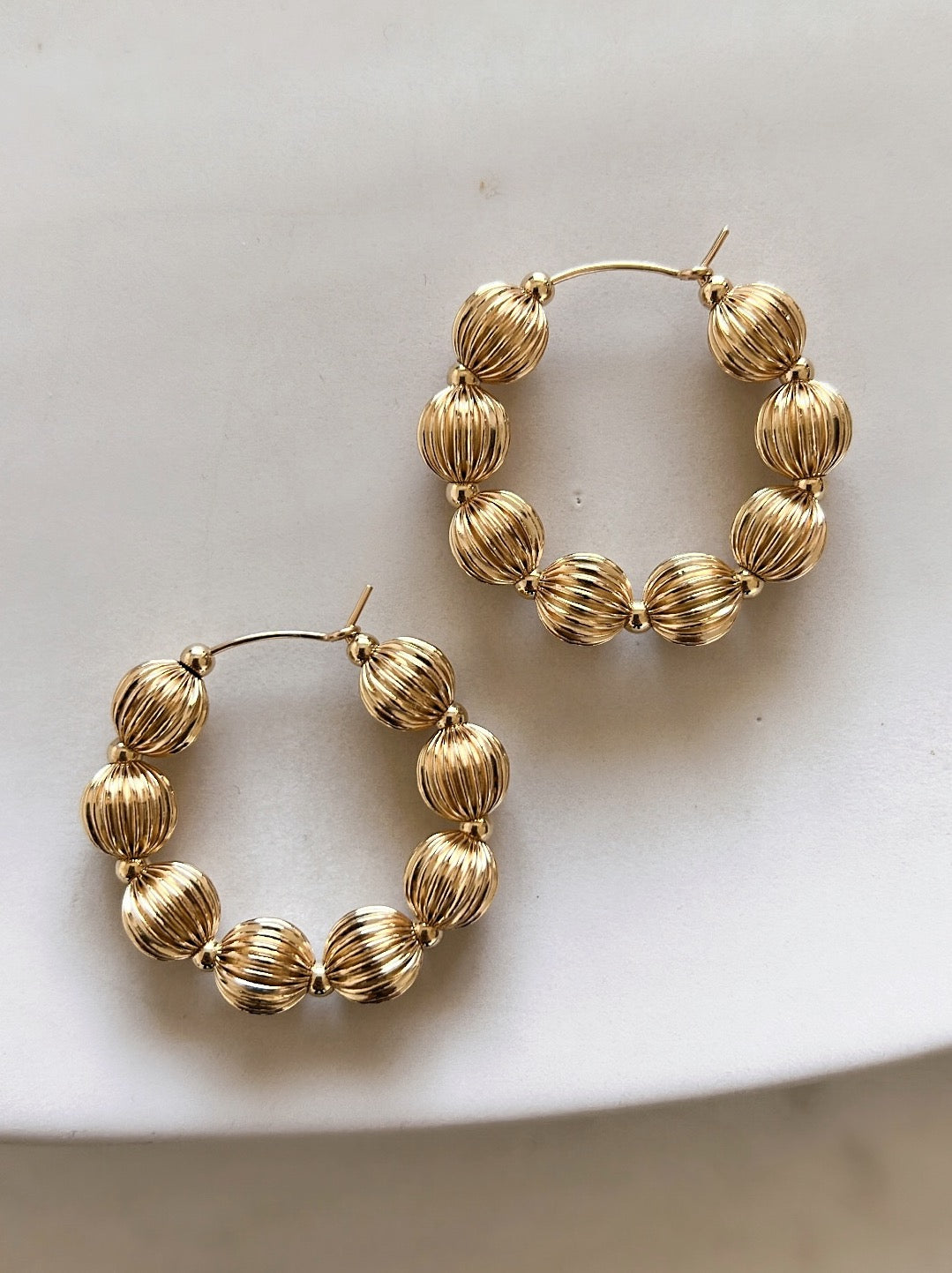 Les créoles Alba, entièrement en or laminé 14 carats, sont composées de perles de 8mm et d'un large anneau de 30mm de diamètre.