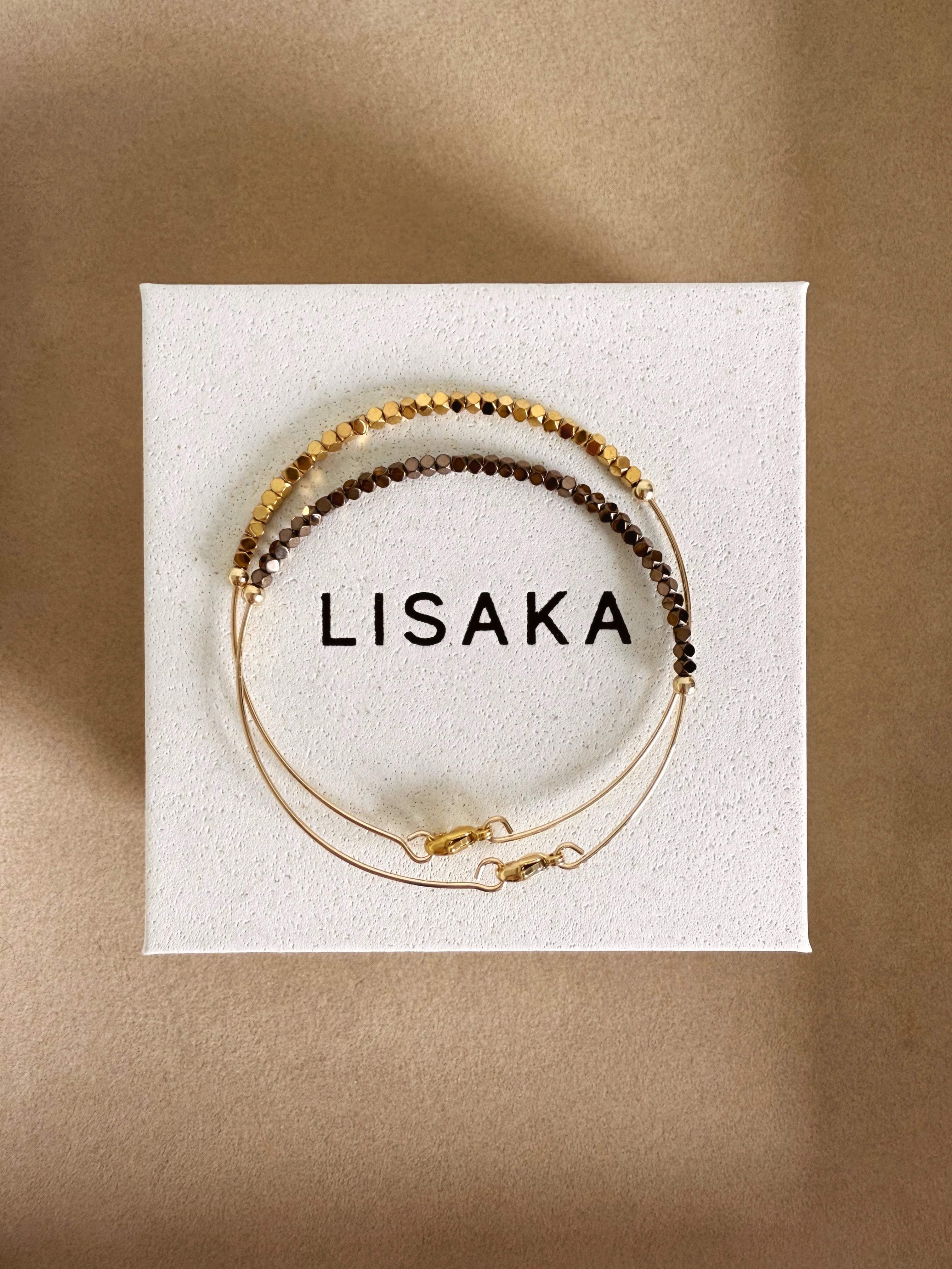 Un jonc aux douces couleurs de l’automne, orné de perles en hématites dorées ou chocolat, et or laminé 14 carats.